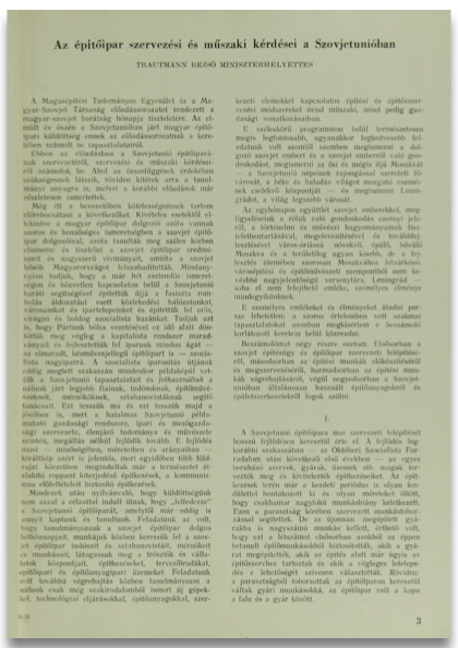 Ebben az előadásban a Szovjetunió építőiparának szervezetéről, szervezési és műszaki kérdéseiről számolok, be. Ahol az összefüggések érdekében szükségesnek látszik, röviden kitérek arra a tanulmányi anyagra is, melyet a korábbi előadások már részletesen ismertettek.